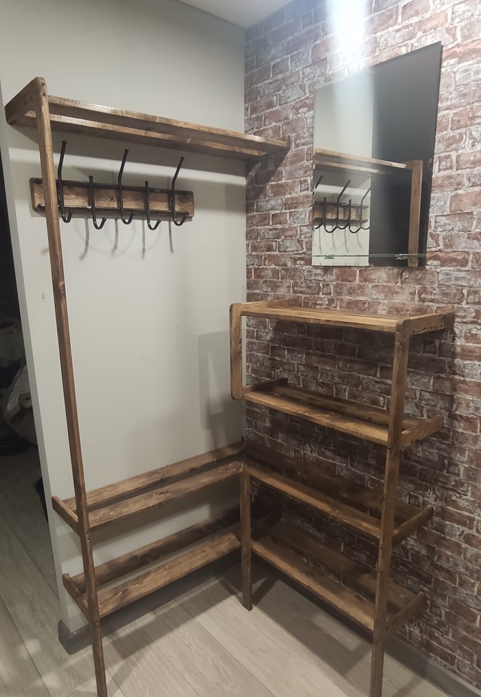 По началу сделал прихожку. Была задача максимально дешево и быстро, т.к. надоело уже, что верхняя одежда везде валяется. Прикупил немного бруса, пару досок, накидал чертеж, и приступил. Вроде получилось, жена довольна.