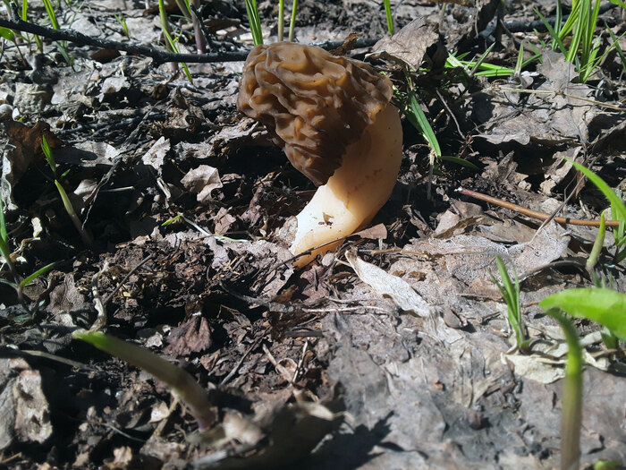 Так выглядит сморчок. Этот сморчок сумел пробиться сквозь плотную прошлогоднюю листву. И выглядит бодрячком.