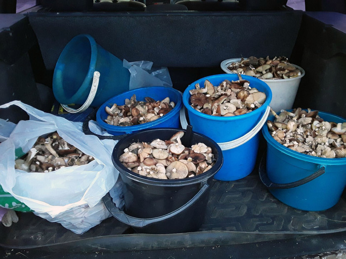 Перебрали ведро. Слева на маринад, справа на жарку, а посередине дождевики - тоже очень вкусные в жареном виде.