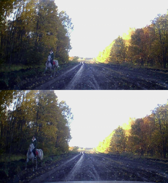 Въезжая в лес, нам навстречу попалась молоденькая наездница верхом на лошади. Видеорегистратор, как оказалось, в машине снимает с чудовищным качеством, по этому прошу простить меня за эту мазню. То что фотографии получились мутными это с одной стороны хорошо - не надо просить разрешения на публикацию у героини этого слайда. Она получилась совершенно неузнаваемой.