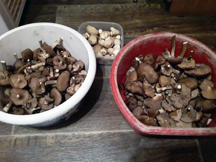 Результат переборки. Два таза - это на маринад. Небольшие и крепкие опята порадуют нас за праздничным столом.