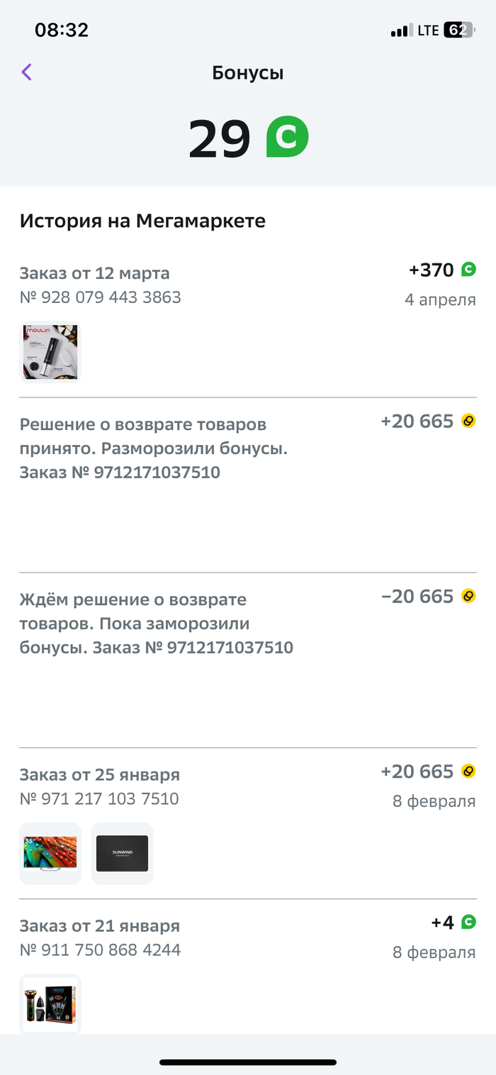 25.01.2024г купил телевизор в Мегамаркет, был очень хороший кэшбек. Проблемы начались с самого начала. Забрал телевизор из магазина( был самовывоз) и т.к. покупка через мегамаркет, то якобы там двойная проверка и все товары целые и без повреждений. И каким же удивлением было для меня то, что когда я его включил он оказался битым, но спасибо представителям магазина (ситилинк) они вошли в положение и телевизор заменили. Дак вот, бонусы спасибо должны били придти 8.02.2024 и уведомленик об из зачислении было, но их нет, есть бонусные рубли. И естественно их вот уже месяца ни как не могут перевести в спасибо. И ни многочисленные обращения в чат поддержки, ни письма, ни звонки не помогаЮт. Они просто остаются без ответа, и по истечению времени закрываются. Делайте выводы, стоит ли верить сладкому кэшбеку. Пруфы и скрины переписок все есть, если кому интересно.