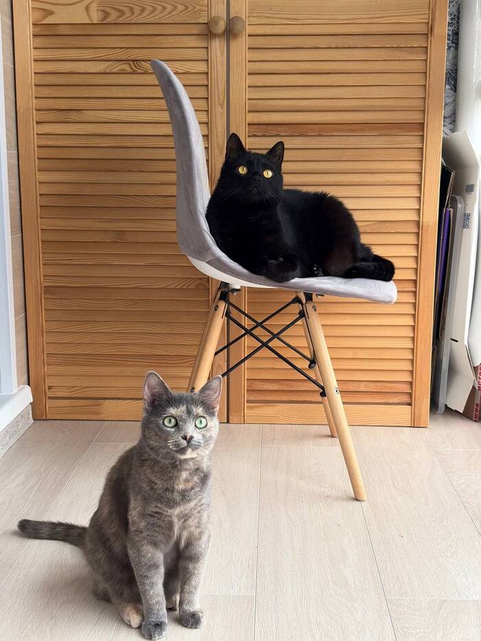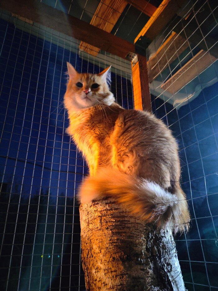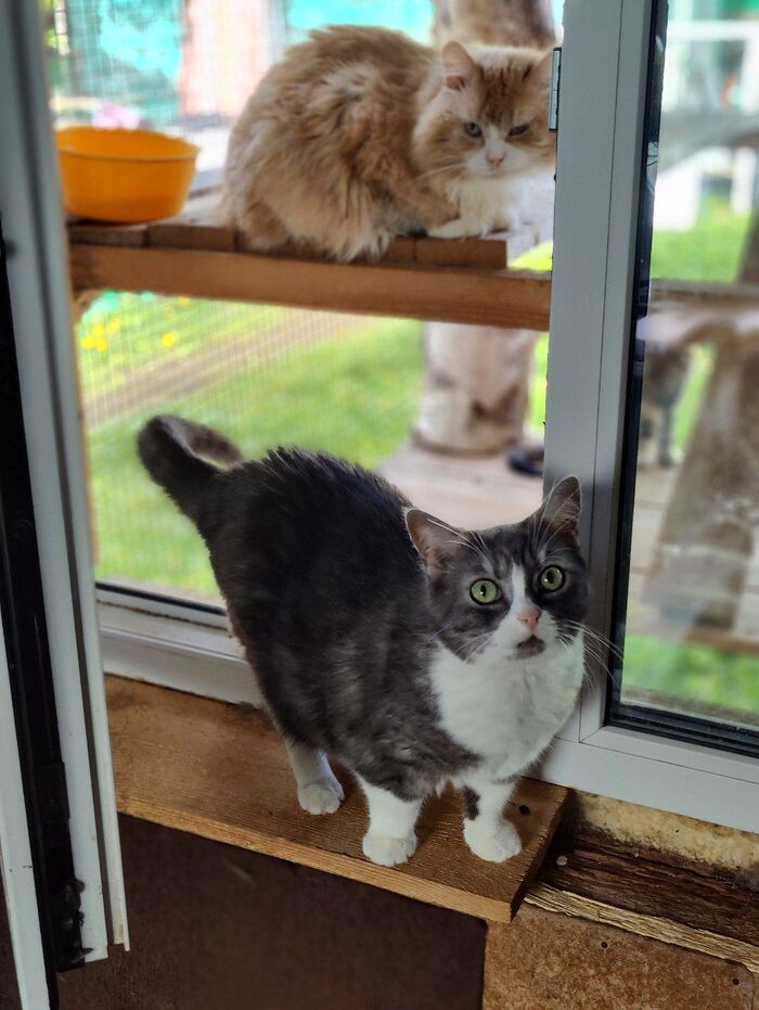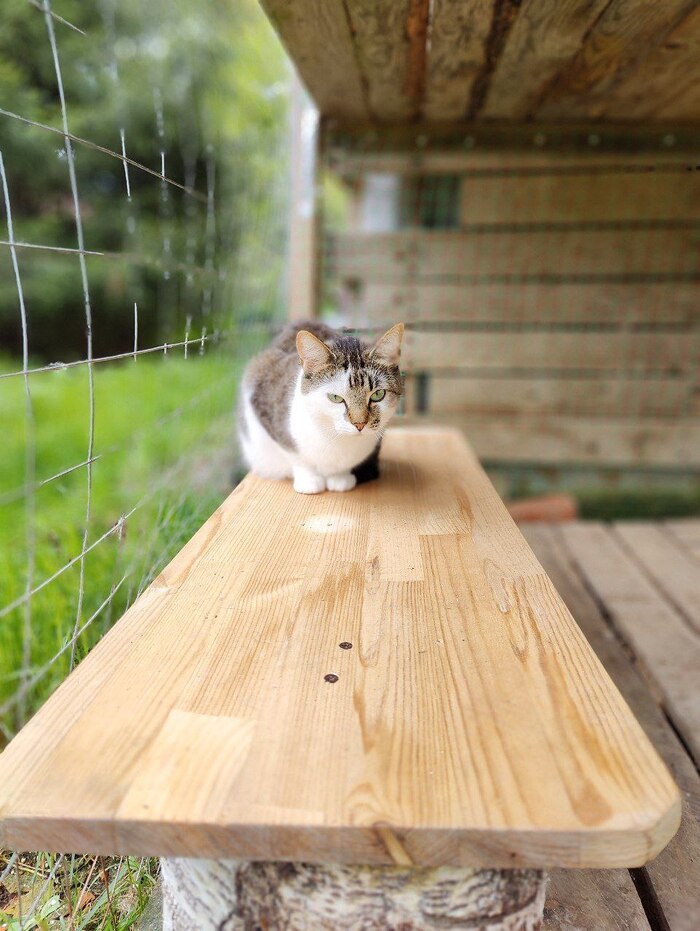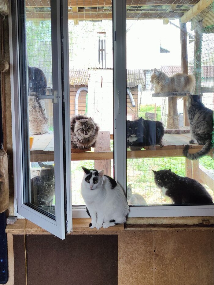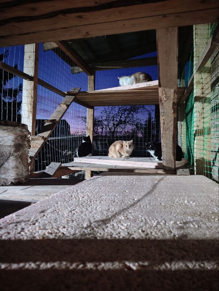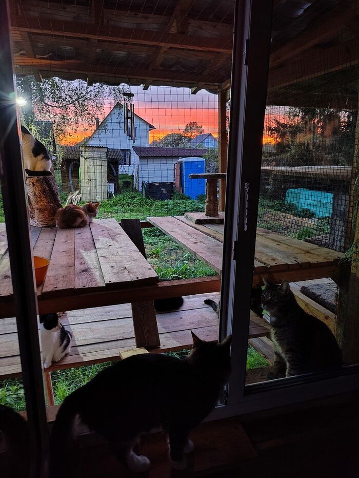 Коты практически безвылазно находятся на улице в катио, смотрят на ежей, сорок и других птиц, закаты, рассветы, ночуют там, даже в дождь не заходят обратно. Благо там есть лотки и вода.
