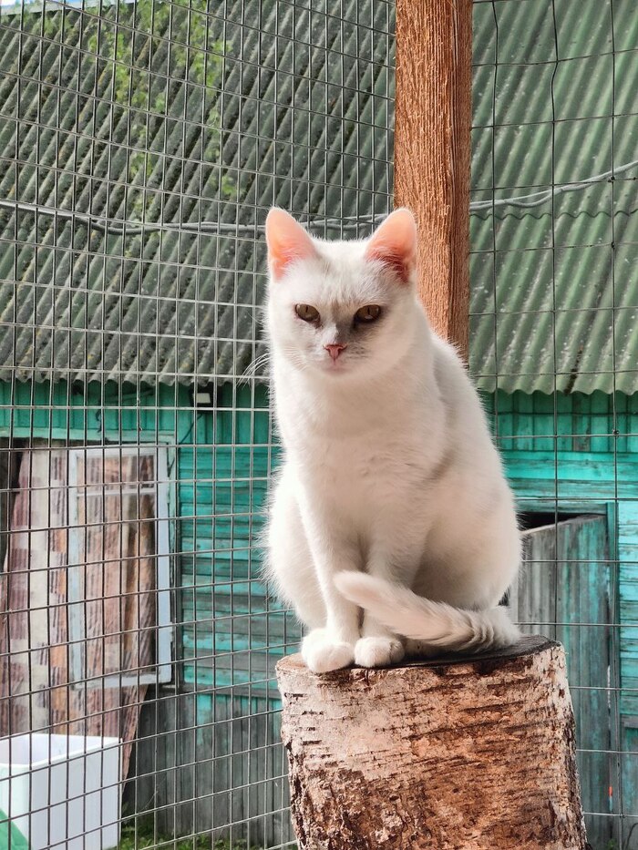 Беляшка попала ко мне очень истощенной, напуганной и несчастной. В добавок - она глухая. Скорее всего, она выжила в пожаре, в котором у заводчицы сгорело 20 кошек, а потом ее отправили в сарай (как она выжила, я не знаю). От постоянного воспаления у нее заросли слёзные каналы (поэтому такие выделения).