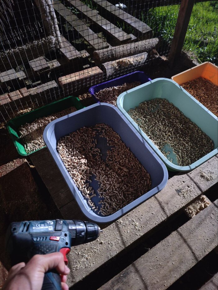 Всем привет. На прошлой неделе убрала весь полистирол, убрала шерсть, почистила все, проверила, нет ли новых дырок. Сделала скамеечку. Продолжила кусок поддона в зону лотков, так как снова все затопило и на участке стоит вода (и никуда не уходит, так как это бывшее болото).