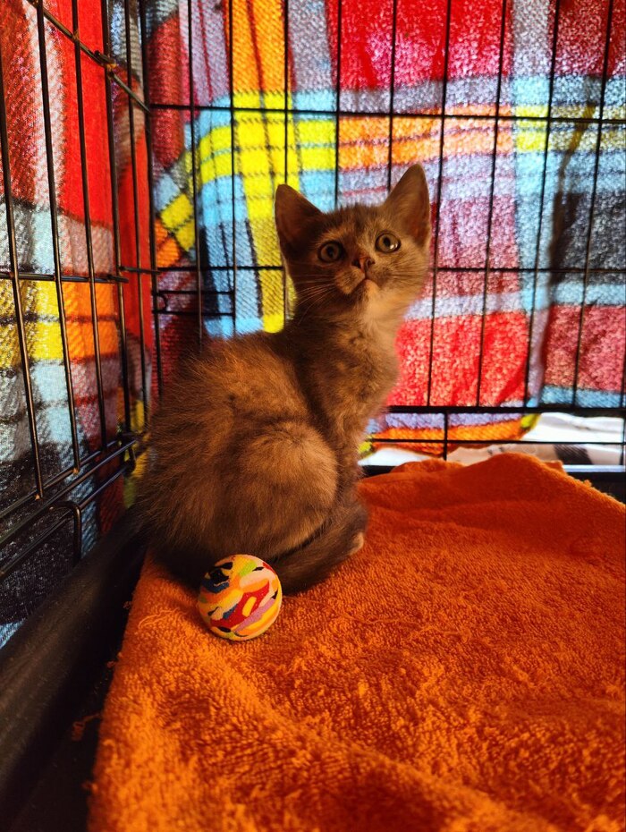 Собираемся с друзьями ехать купаться и загорать. Зашла в ВК. Увидела пост и понеслось. Сначала поругалась с ТС из-за того, что он не дал мне телефон того, кто фотографировал. Была жара и котенка мог хватить удар. Потом, не долго думая, мы мчимся в дорогу. В пути обзваниваем знакомых, которые могли бы хоть отнести котенка в тень. Находим таких знакомых. По приезду нас уже ждут с котенком в коробке.