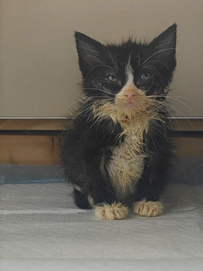 Котенок практически не подает признаков жизни и весь покрыт кровью - съеден блохами.