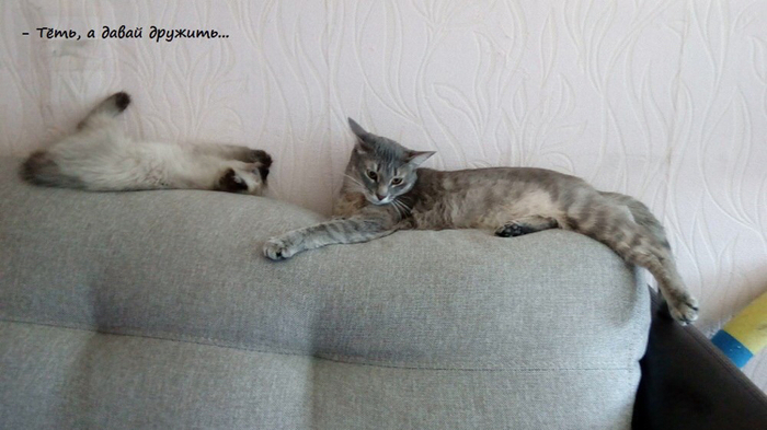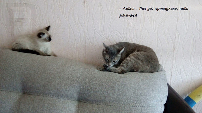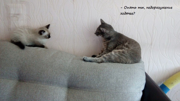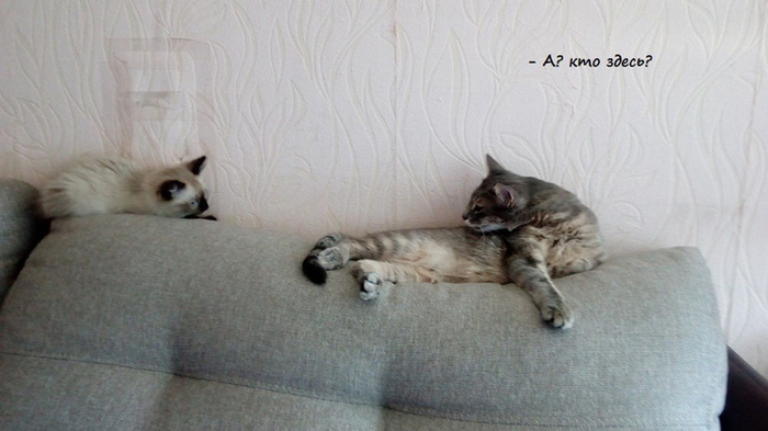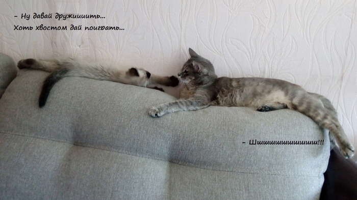 В общем, ушла Маруська в спальню на подоконник, отвернулась к окну и начала изо всех сил обижаться. Правда, от еды и вкусняшек не отказывалась))) Ланс проявлял разумность и не лез лишний раз; если оказывался рядом, Маня шипела и котёнок быстренько ретировался. Дня через 3-4 до Маняши дошло, что сидеть на окне - не лучший выбор, подоконник узкий, пузику жестко, так что к концу недели можно было застать ее спящей на кровати, но заметив людей, обижулька вновь запрыгивала на подоконник и продолжала дуться. Хватило ее на две недели, потом сидеть одной надоело и Маха вернулась к привычной жизни и дивану, но наглого подселенца отгоняла грозным шипением, а Лансу так хотелось пообщаться с новой подружкой! Вот типичная ситуация того периода: