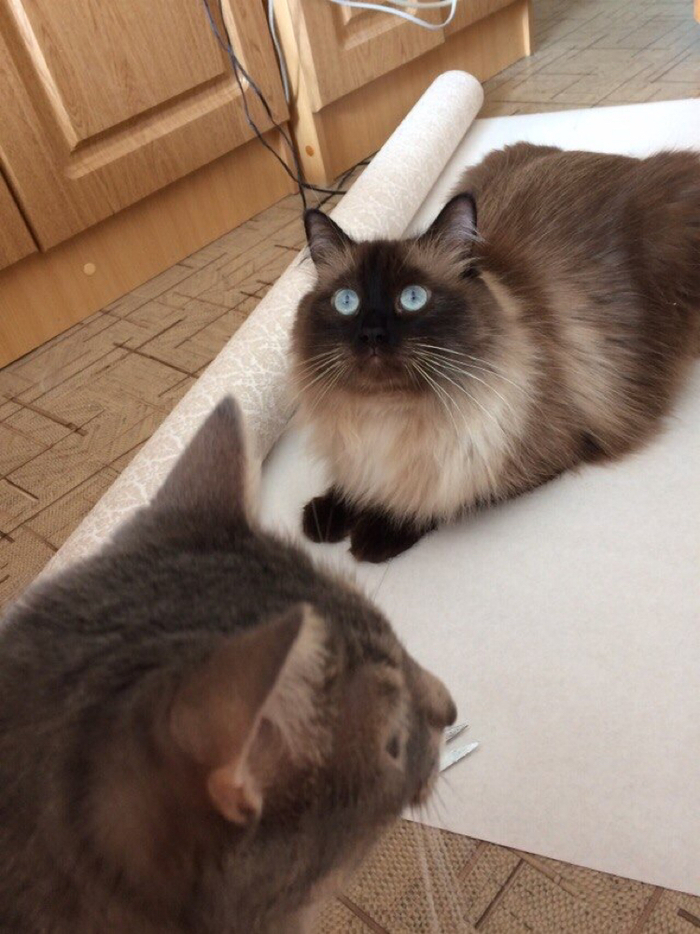 Несмотря на то, что решение взять второго котёнка оказалось спонтанным, оно было вполне взвешенным и обдуманным: у меня есть две комнаты, чтобы пушистиков изолировать друг от друга с комфортом, режим моей работы и учеба сына пересекались достаточно удачно, чтобы котейки находились без людей не весь день, а только 3-4 часа, ну и я рассчитывала на врожденный и все ярче проявляющийся пофигизм и добродушие Маняхи, которая, вернувшись из деревни, была совершенно ошарашена присутствием в доме нового жильца. Первой реакцией была даже не ревность и не агрессия, а офигиние: «Святые Печеньки, что это за чудо-юдо?»)) Конечно, Маруся знала, что в мире бывают другие коты, но все они серые, с полосками и жёлтыми глазами и называются «семья», а это черно-белое пушистое нечто с голубыми глазищами, это что вообще такое?!