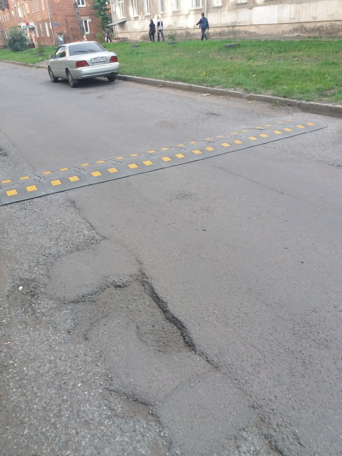 Дорога и так в ужасном состоянии, а ее еще и искусственно испортили. Самое интересное, что между этими лежачими полицейскими нет ничего, кроме протоптаной по газону тропинки. Вот смотришь на такое и думаешь: им срочно нужно было отчитаться об установленных лежачих полецейских и они просто бездумно выбрали самую раздроченую дорогу?