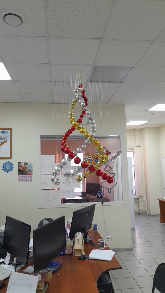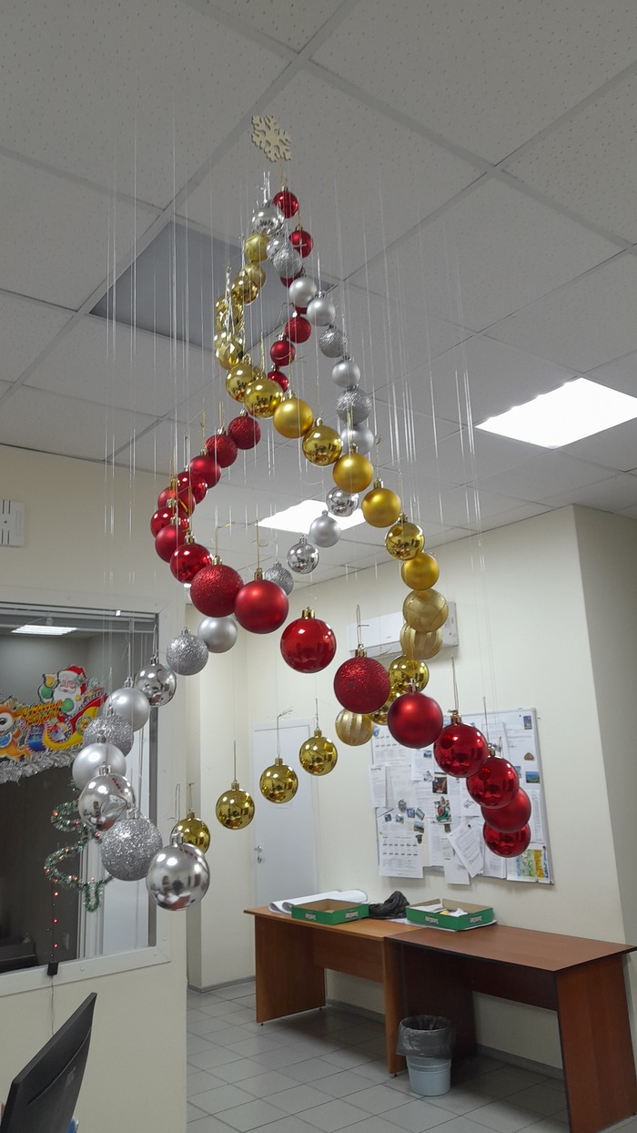 Уже второй год на работе делаем подвесную елку из шариков. Как всегда все началось с идеи, которую я взял у славного пикабушника @melomanru, вот из этого поста Комментарии автора к посту «Подвесная ёлочка из шариков».