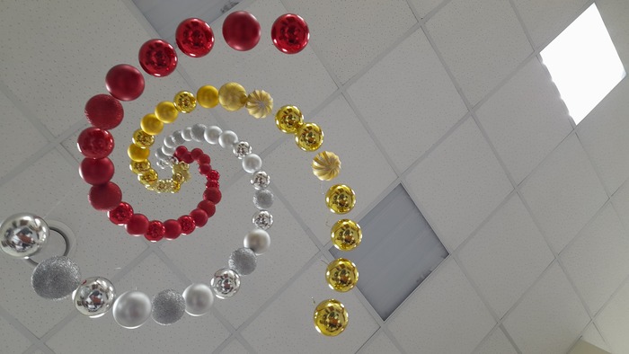 Неплохо, но и не супер. В этом году захотелось идею развить и было решено попытаться сделать спиральную елку. Имеющихся шариков двух цветов показалось мало, поэтому добавили шарики третьего цвета. Итого получилось 3 нитки, по 25 шариков в каждой.
