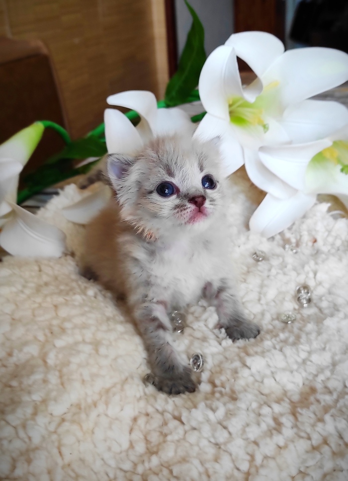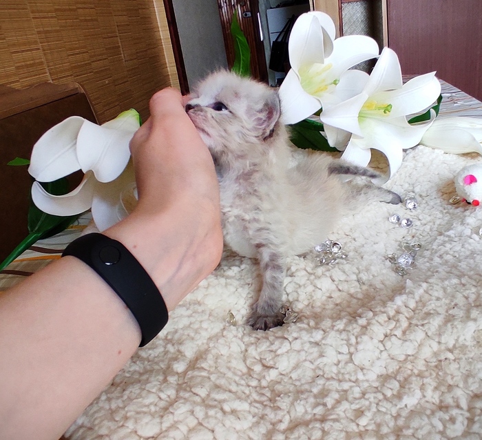 Сразу говорю, что у всех маленьких котят сначала голубые глаза, а потом в 2+месяца меняются на постоянный цвет. Вес выше представленного котика (на днях взвешивала, средний вес)