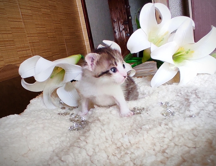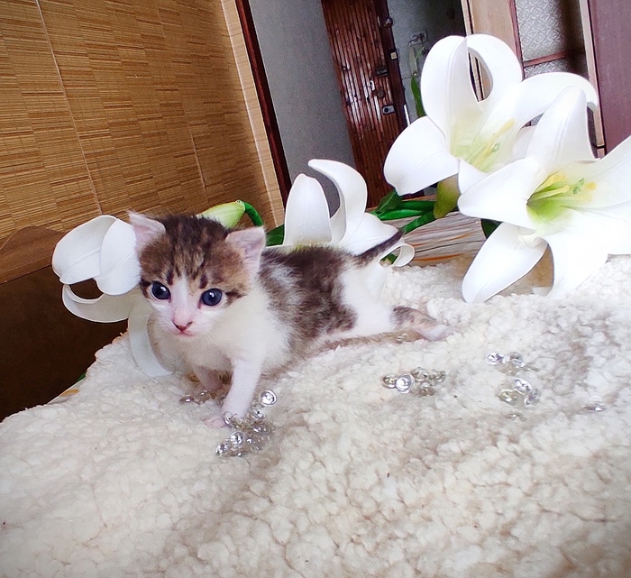 Это девочка Вафелька, по мнению нашей семьи, она самая страшненькая и маленькая, но при этом ее характер вывозит всё - она очень умная и деликатная кошечка с разумным взглядом. Бело-тигровая. Если бы я могла оставить одного котенка, то это была она (у меня с мужем аллергия и если я ещё пережила б чесание постоянное, то у мужа реакция в виде отеков)