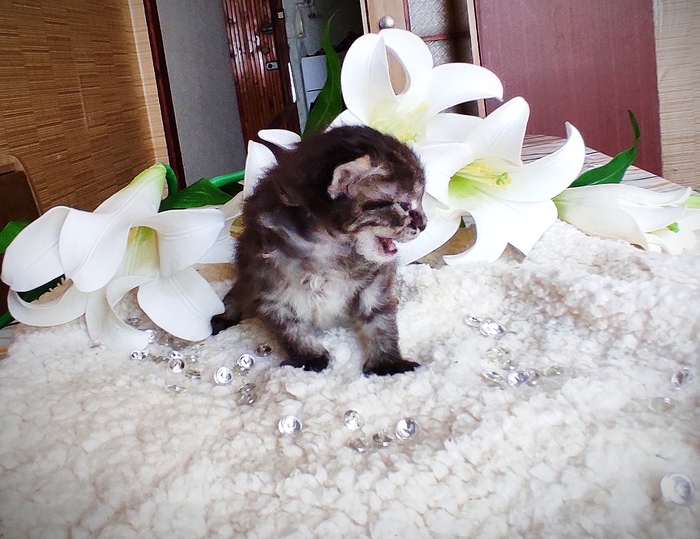 Из приятного - отваливание пуповинок, ползания, первые шаги на полусогнутых лапках, открытие глазок, первые игры, признание меня своей мамой, первое мурчание и вылизывание.