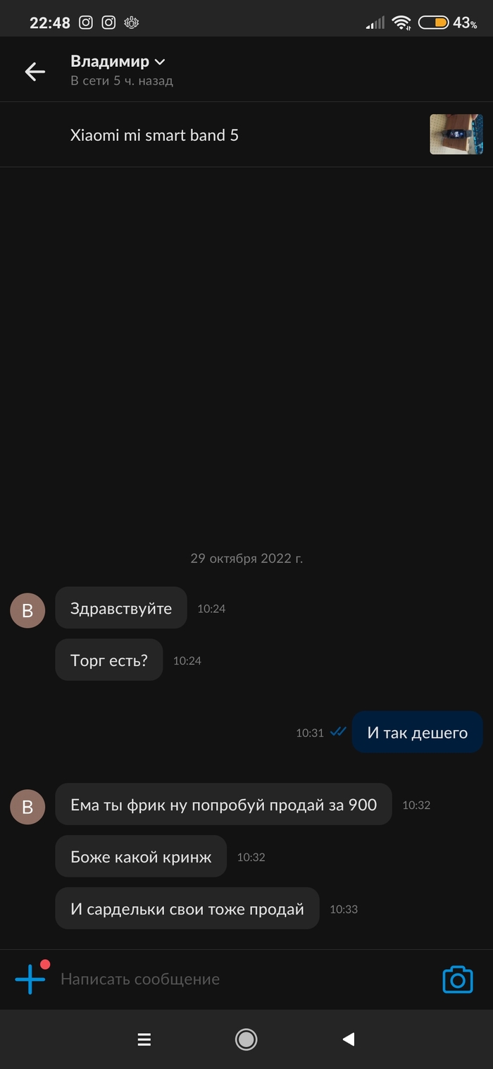 20 antikiller06 Ответ на пост «Что у людей в голове?»2 3 года назад Продавал смарт браслет, но может и вправду сардельки продавать б/у? . Показать полностью 1 [моё] Авито Клиенты Скриншот Ответ на пост Длиннопост Ещё 0
