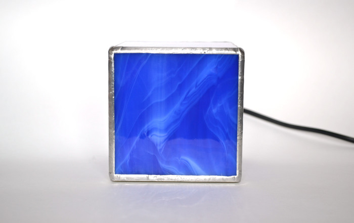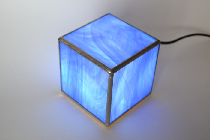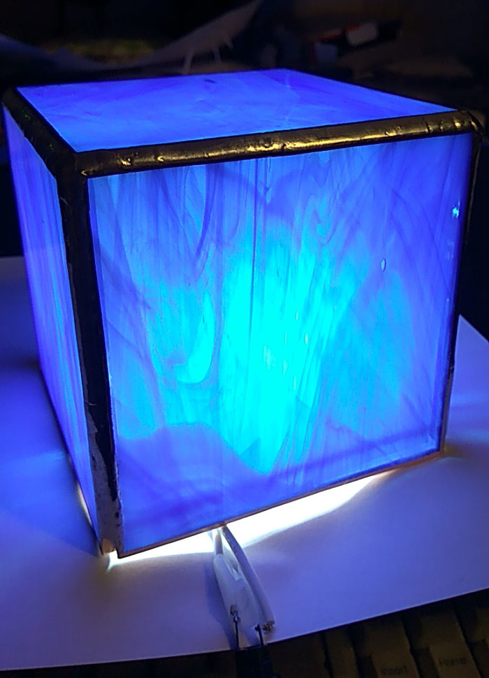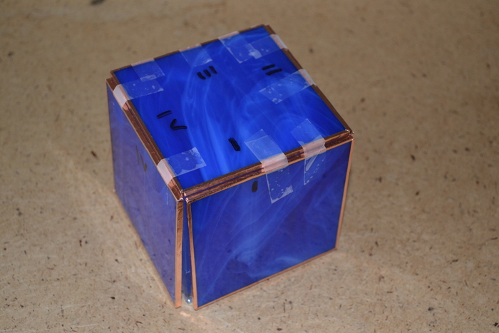 Спаиваются фрагменты стекла, припаивается рамка из луженого профиля, крепления. Наклеивается фон.