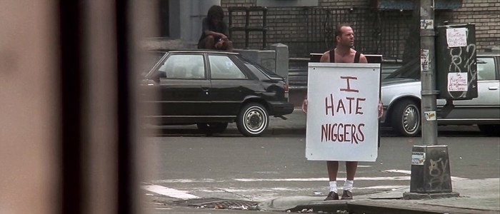 На протяжении всего фильма герои подкалывают друг друга на тему расизма. А самой запоминающейся сценой фильма стал эпизод, в котором Джона Макклейна по приказу террориста запускают в Гарлем с огромной табличкой "Я ненавижу ниггеров". Естественно, герой очень быстро попал в критическую ситуацию. Интересно, если сегодня встать с этой табличкой на одной из улиц Миннесоты или любого крупного города, как быстро можно получить проблемы?