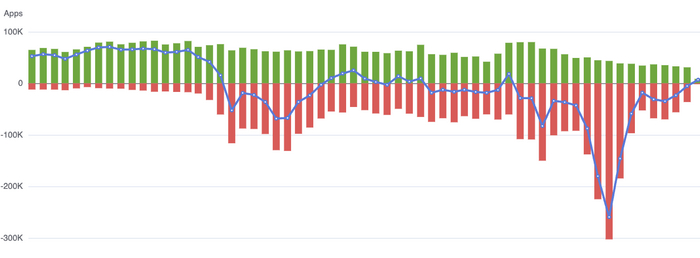 А учитывая, что ежемесячно публикуется 30-80 тысяч приложений, все оказывается еще грустнее.