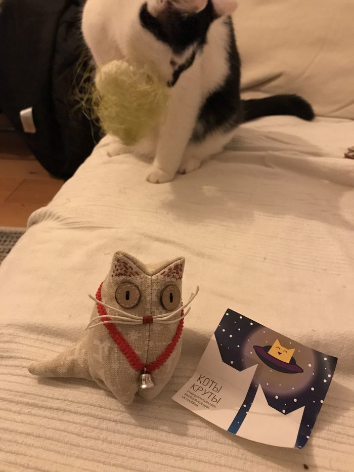 Звезда шоу, обалденно пахнущий корицей, праздничный кот! Его пришлось обменять на шуршалку, а то даже фотку сделать не давали: