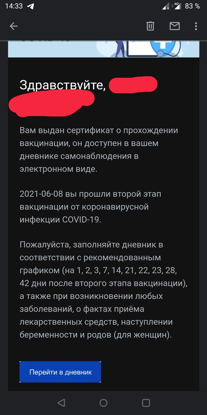 Как сознательный гражданин, записался на вакцинацию от ковида. Укололи первый компонент (побочек не было даже в виде повышения температуры), но через 10 дней жене подтвердили ковид (должна была идти на вакцинацию на следующий день). Как полагается, вызвал врача, врач взяла мазок и сказала, что если "+", то отсрочка по вакцинации до "-" результата, но результаты не приходили 2 недели (в ркн сказали, что по регламенту даётся 48 часов), из симптомов у меня слегка болела голова и на полдня пропало обоняние. Т.к. никто (всякие горячие линии) не мог сказать "какие мои действия", пошел в дату укола второго компонента в поликлинику, в кабинете вакцинации сказали идти разбираться к заведующей поликлиники, той ваще все пофиг: " Жди "-" или вакцинируйся на свой страх и риск."
