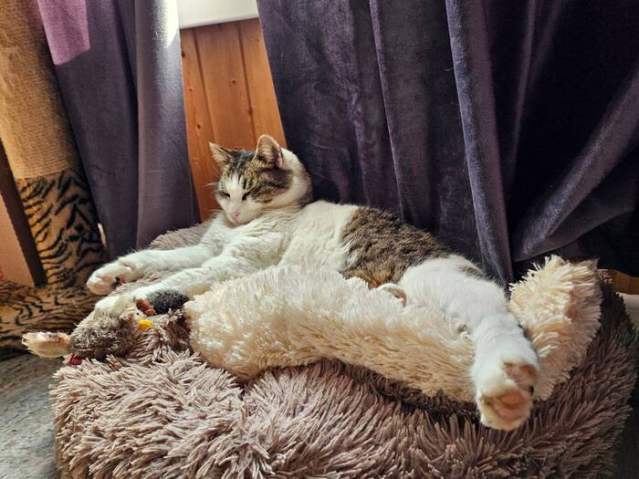 Приятности на этом не закончились. Волонтер Екатерина Гуренкова, которая спасла сброшенную Мусю, подарила ей новую постельку.