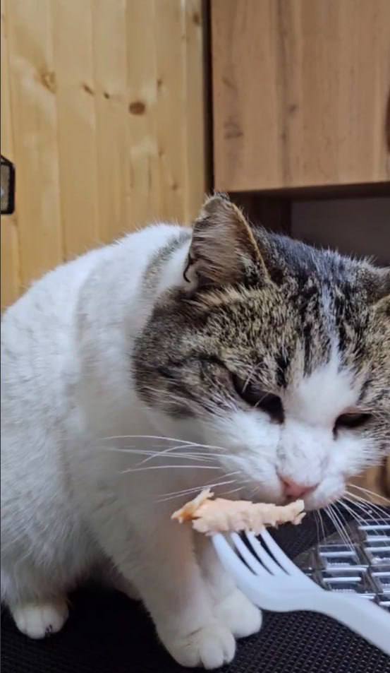 Кошка, хоть и проходит курс лечения, но чувствует себя очень комфортно. Мурлыке на ужин предложили отварную форель. Деликатес явно пришелся ей по вкусу.