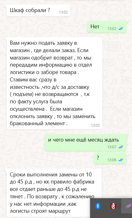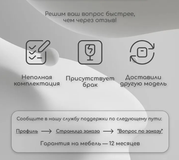 P.S. Я написал отзыв на этот шкаф и продавец мне ответил - "Добрый день, благодарим Вас, что нашли время оставить нам отзыв! На всю нашу продукцию распространяется фабричная гарантия, ознакомитесь, пожалуйста, с крайними фото в карточке товара и напишите нам в чат, в случае необходимости." То есть намёк - типа ах ты посмел плохо про нас написать - ну значит будешь ждать долго. Но ничего - я подожду.