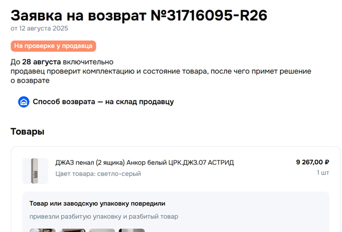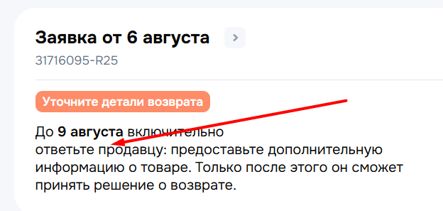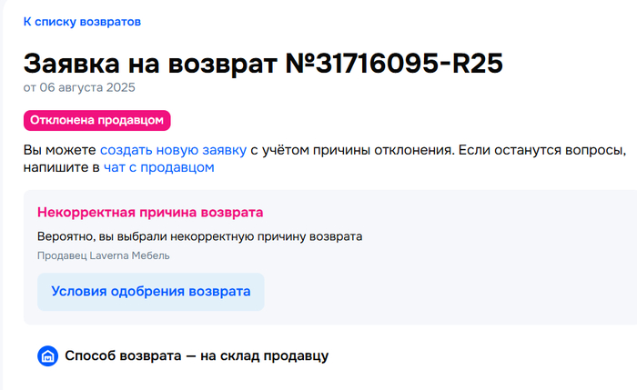 Итог - заявка на возврат отклонена продавцом по причине некорректная причина возврата