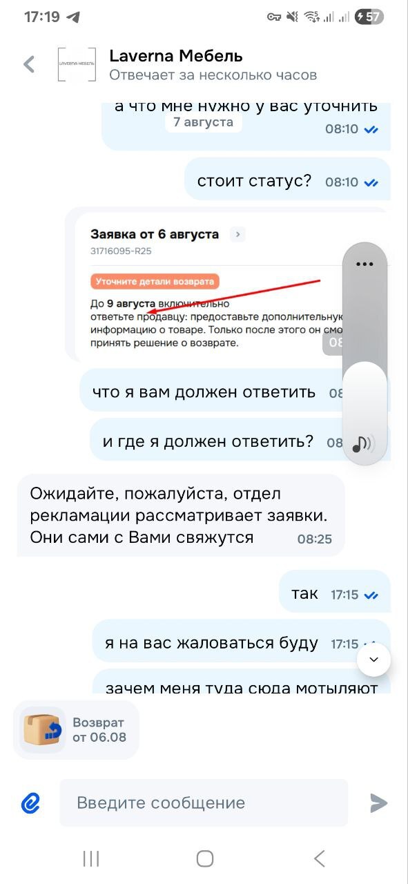 Через 3 дня у новой заявки появился статус что в течение 5 дней отдайте товар продавцу, приедет курьер забирать - вот номер телефона курьера, готовьте товар к возврату. Ну хорошо, упаковал, всё огонь, жду. Никто не едет. Звоню по номеру телефона указанному в возврате - там парниша - что? какой возврат? не в курсе... ладно уточню и мы перезвоним... Не перезвонили.