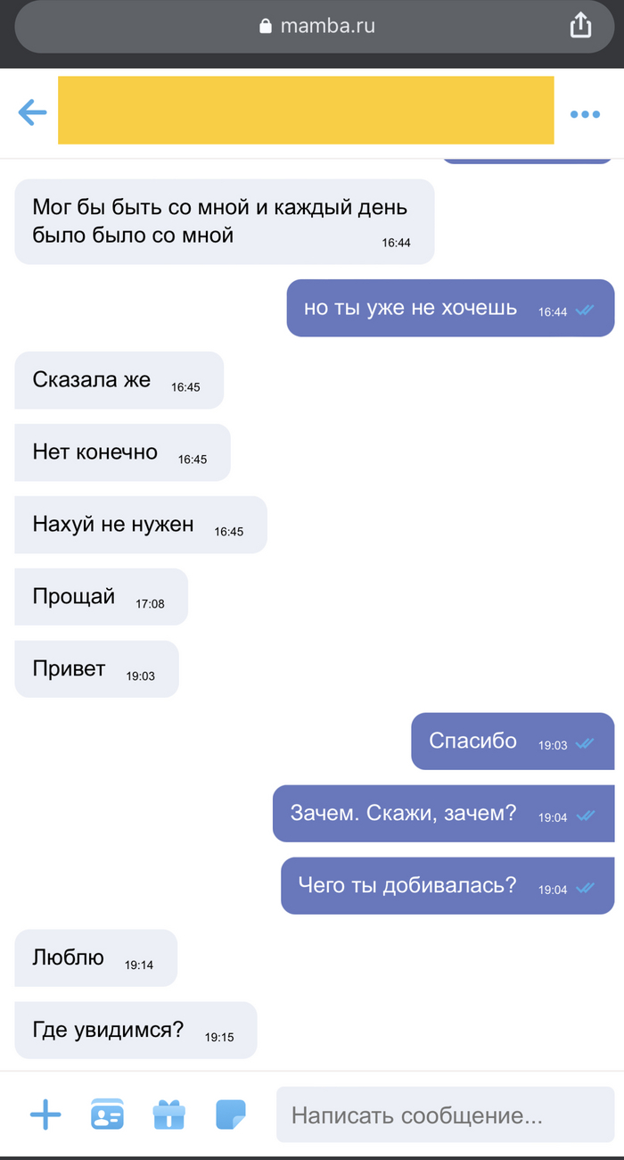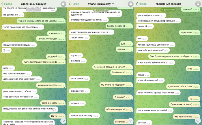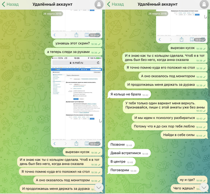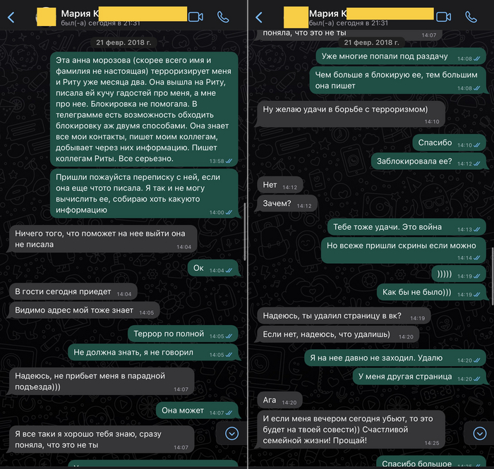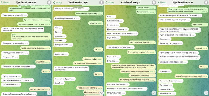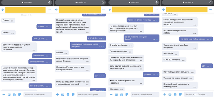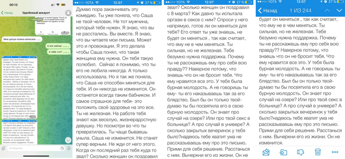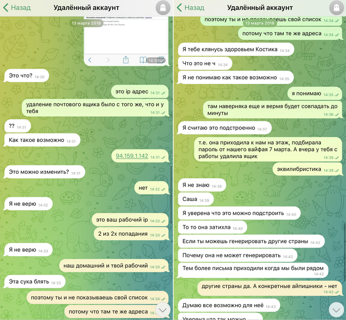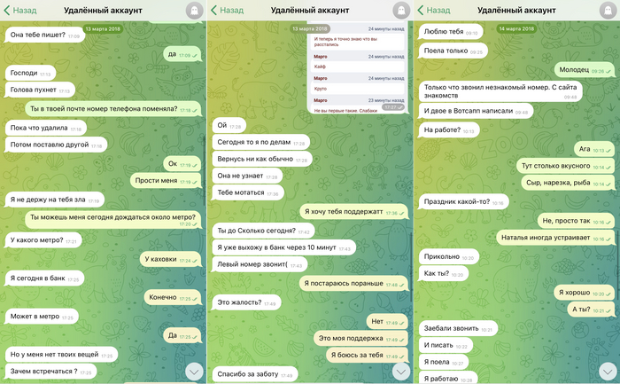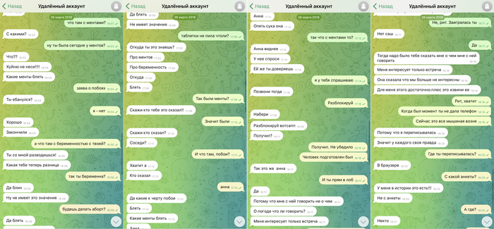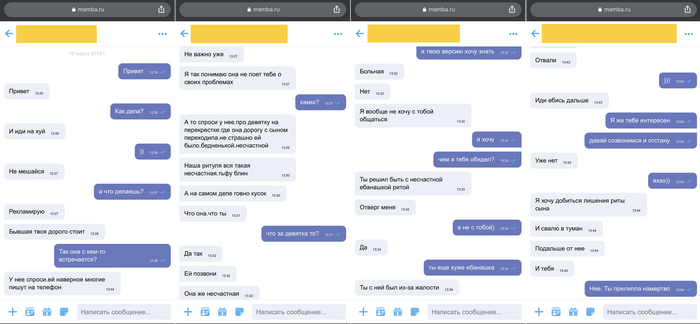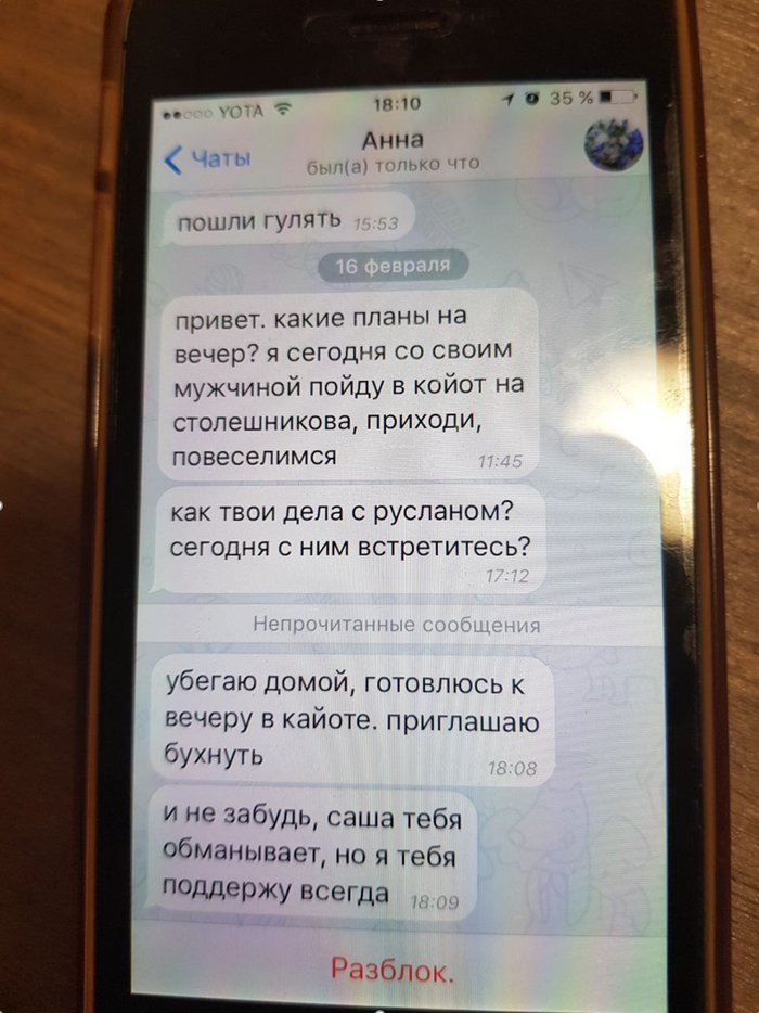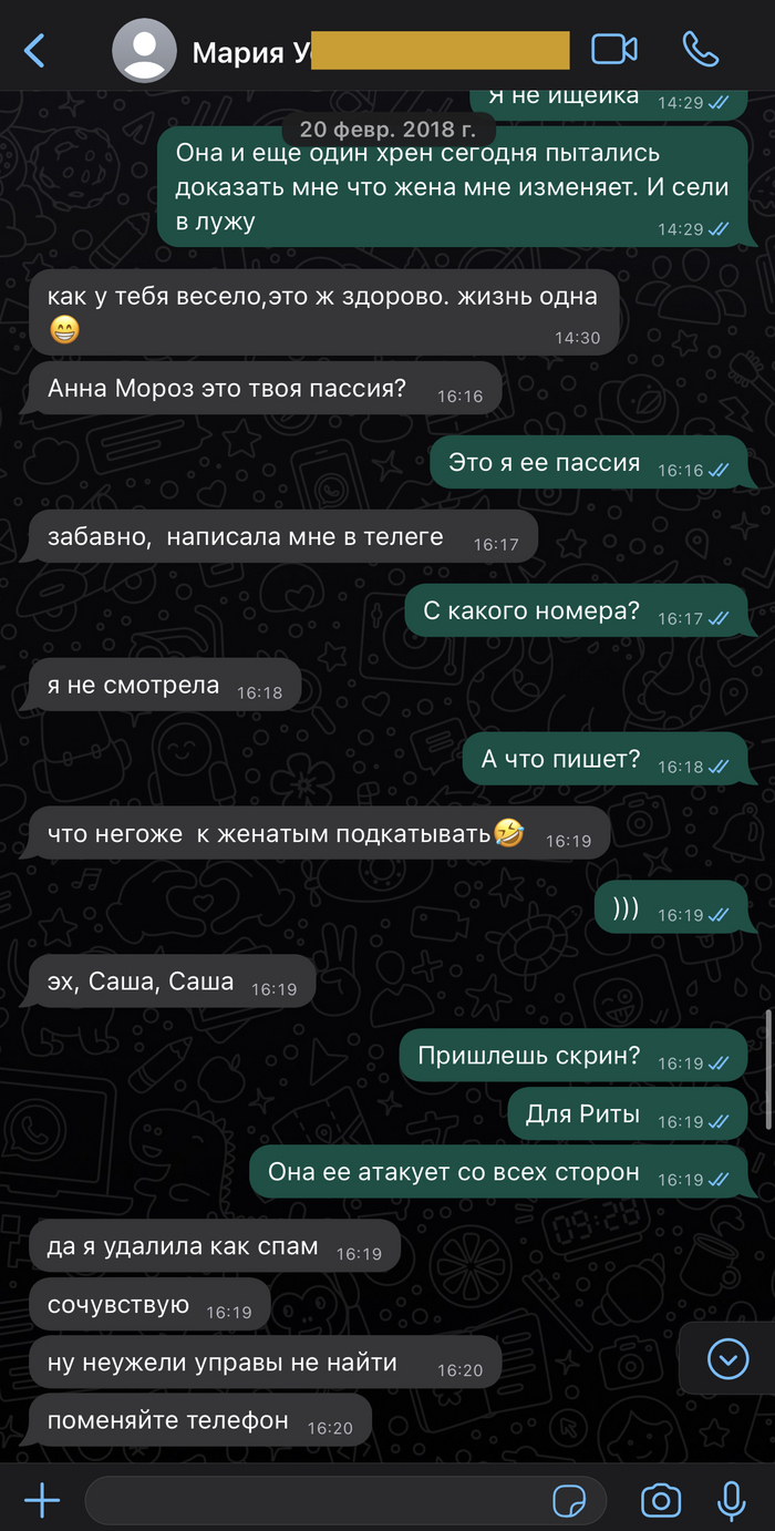 В дальнейшем эта переписка мне выйдет боком. Жена будет в ярости от того, что я общался с ее друзьями. Ах да, забыл сказать – это ее давние друзья и этот муж, конечно, слил жене инфу.