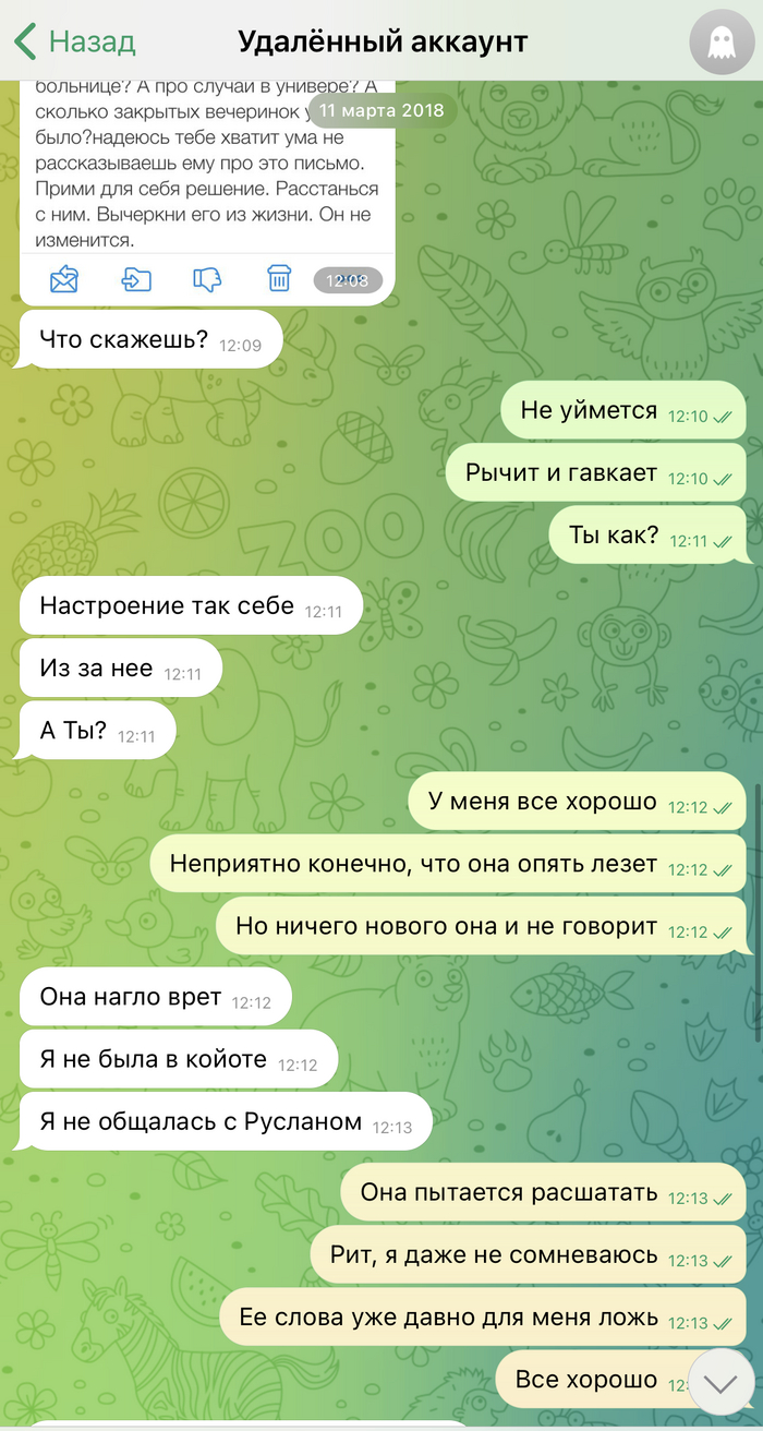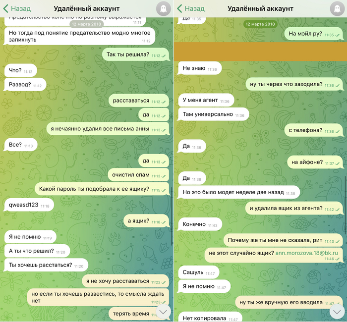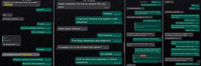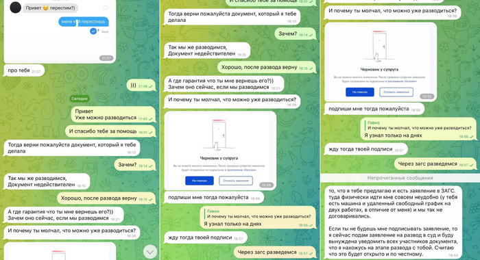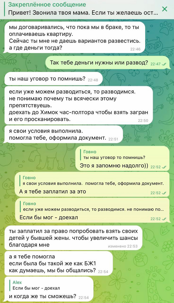 10 дней она наслаждается отдыхом, постит фоточки в инсту, шлет мне мемасики-прикольчики, а когда прилетает я получаю на почту уведомление от гос. услуг о разводе. Что ж, уже становится понятнее. Я звоню с этой новостью моей маме, мы это обсуждаем, ведь у нас предстоит суд за детей, мама очень переживает по этому поводу. Мне жена ничего не объясняет, почему она так поступает, поэтому ей звонит моя мама. После этого я получаю от жены следующее сообщение.