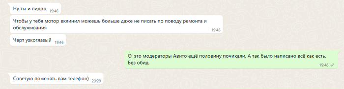 P.S. После того, как на Авито был опубликован данный отзыв, от мастера последовали угрозы, оскорбления по национальному признаку, а затем телефонная флуд-атака.