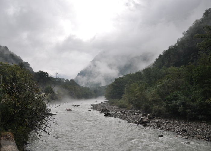 В другую поездку мы отправлялись в сплав по реке Бзыбь. Начался ливень с утра, но мы решили, что мы не слабаки и все поехали. Это было экстремально) когда врезаешься в волну и тебя обдает ледяной водой, то мощно приходишь в себя, адреналин зашкаливает и гребешь-гребешь-гребешь. Машина, которая нас привезла ехала вдоль реки и останавливалась, чтобы снять нас с высоты. В конце поездки были фото, всем раздали (конечно за доп плату, но что-то в районе 300 р, в общем, недорого). После нас по дороге домой отпаивали коньяком, чтобы мы не заболели. Бутылка коньяка вернулась мне и я протянула ее одному из организаторов, а мне сказали, прячь себе, потом выпьете дома)