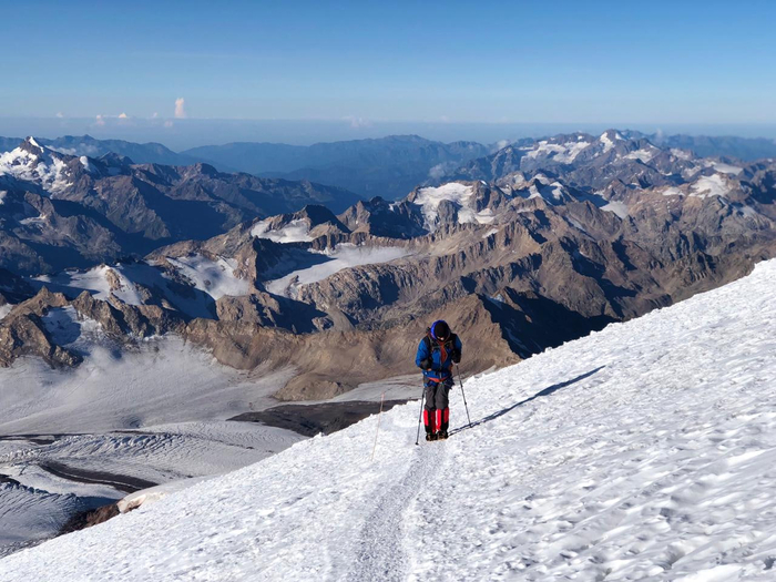 Первый раз я оказался на вершине в 2019-м "как обычный турист". Потом и в 2020-м повторил уже с палаткой, без подъемников и в одну каску. А потом так сладко рассказал об этом маме, что в 2021-м она тоже поднялась аж до седла на 5000 метров!! Между делом пост про маму.