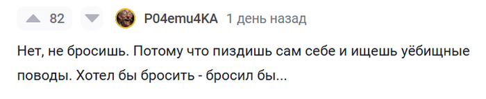 У одной девушки, с которой я работал, на её заявление, что она собралась похудеть на 20кг её муж хрюкнул со словами “да куда тебе, сиди и не рыпайся, я тебя знаю, всё равно бросишь через месяц, как наиграешься”. Она два месяца не могла отойти от этих слов. Два грёбаных месяца! Думаете она такого эффекта ожидала, когда рассказывала? А вот оно как получилось.