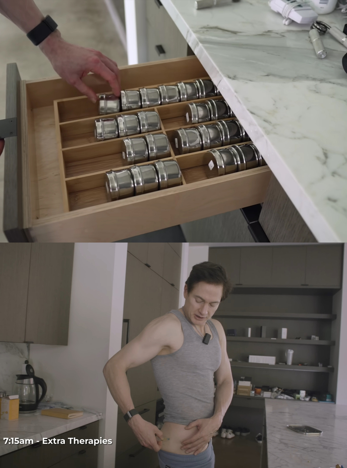 БАДы у него хранятся уже посчитанные и расфасованные. А что не влезло в таблетки, загоняет напрямую.