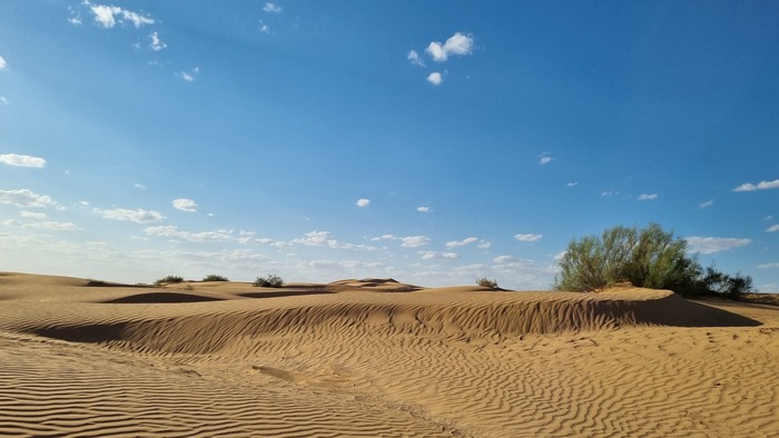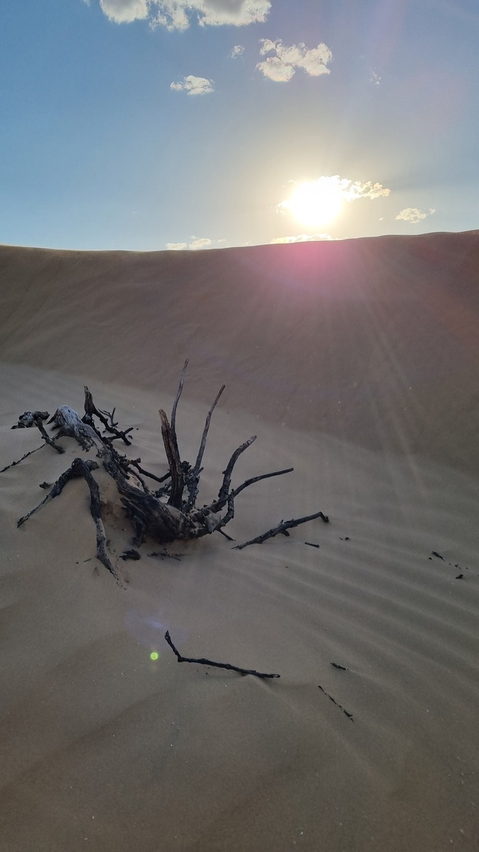 Дмитрий нас привёз самыми первыми и мы увидели нетронутую красоту местной пустыни, окружённую степью. Важным замечаним Дмитрия было то, что этот бархан иногда посещают дикие лисы, поэтому обувь лучше оставлять внутри машины(бывали случаи, когда лисы воровали обувь и туристы некоторые туристы возвращались в одном ботинке), тем-более что по песку гораздо приятнее ходить пешком. Песок - как мука, ощущения невероятные! По песку пробегают иногда ящерицы, которые, если их окружить, начинают мгновенно зарываться в песок.