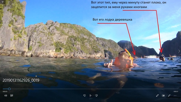 Расстановка лодок, яхт и говна деревянного в бухте, а также план местности (на гугле потом посмотрите). В общем бухта метров 100 на 100. Наш катер встает в указанном бакенами месте. Гид говорит: - Ребята, Р-е-е-е-б-я-я-я-я-а-т-а-а-а-а! Плаваем между скалами и носом лодки, вам этих 40 метров хватит, к скалам не лезьте, там говно. Ну ок. Прыгаем, как в видео в пред идущем посте, тока в амуниции. Плывем. В метрах в 50-100 от нашей стоянки, стоянка еще лодок: одна норм-три-мотора и с пятак деревяшек (говно такое с палкой выдвижной на которой винт гребной). Плаваем, хули. Я еще и с ГоПро (китайским аналогом), чё-то снимаю.