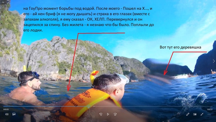 Экшон начинается. Плаваю я плаваю, снимаю воду, под воду, вокруг себя, в общем веду себя как какой-то йобанутый блогер (видос для пруфа есть, из него раскадровка, опять же если получится прикрепить). И внезапно чувствую, прям чувствую меня сзади обхватывает руками и ногами мужик (прям как в захват). Я в ахуе, так как иду под воду от нагрузки. Стараюсь вытянуть шею вверх и захватить воздуха, своими руками пытаюсь этого мудока оттолкнуть, в голове мысль – блять он на меня сесть пытается, может прикол (пранк), может наезд, я, хуй его знаю, там мысли стреляли из пулемета, но одна мысль как бы отделилась от потока говна: – "под тобой 6 метров, старайся над уровнем воды держать голову, жилет…" а хули жилет, он, хуило, опирается на меня и от импульса я иду под воду. Короче, я поворачиваю голову, вижу лицо, ощущаю запах из рта, и, да, это алкоголь, он же перегар, и глаза чувака – который сказал что-то (спойлер: Серега в этот момент услышал, а он плавал в метрах полтора от меня, как чувак мне сказал - I can't breathe [машинный перевод - я не могу дышать]). Ну это им с Серёгой заебись, они английский знают, а мне.. меня топит какой-то хуй, какую-то хуйню на вражеском говорит. В бошке у меня мысли правую чуть высвободить и въебать ему в район виска, НО, предохранители – драка на глубине не уместна, и в тайской Тюрьме нет шконок. Я выдавил из себя – Пошёл на хуй! И сдвинул брови! (причем – это был не грозный крик, это был какой-то писк мышки или блохи с отверстия в мохнатой мышке. Но, чел (заметьте что я уже ухожу от оскорблений, патамушто натовичёнка становится жалко), произнес с акцентом тихо-тиха «Ват, ват нахуююй?» и пиздец – его глаза, глубокие с какой-то пичалью. Я ему говорю: Ок, Ок, нормал, нормал. Хелп. Хелп. Он отвечает – Ес, Хелп. Я переворачиваюсь, высвобождаюсь так чтобы занять горизонт, он цепляется за спину (опирается на неё одной рукой). Я базарю и тыкаю в лодки в далеке (метров 50 которые) - Юар бот вайт? Он пыхтит – ес, вайт. Я окей. Сам кричу Серёге – забери у меня ГоПро и доплыви до гида – скажи натовец тонет. Но увидев нашего гида сам заорал на всю эту ванильную бухту – Андре-е-е-е-е-е-й!!! Он – ч-ё-ё-ё-ё-ё? Я ему - Тело тонет, возможно обожранный, за меня вцепился, плывём к его пироге!!! [ору прям в полный голос, что аж фотографирующиеся тёлки на деревяшках в этой красоте оборачиваются] Гид в ответ – сам справишься? Вот тут я (как говорят психологи) слабину дал, смалодушничал из-за своего глубокого внутреннего мира и влиянию мнений из в не, и заорал – конечно справлюсь. Хули, плывем же парой – я, и говноед натовский.