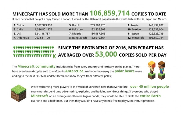 Разработчики утверждают, что, если всех покупателей Minecraft объединить в одну нацию, получится страна, занимающая 12 место по численности населения в мире. Minecraft обладает пользователями в каждой стране в мире. 4 копии даже было продано в Антарктике. Каждый месяц более 40 млн людей играют в Minecraft и, если все, кто когда-либо играли в Minecraft, возьмутся за руки, получившаяся цепь сможет обвести нашу планету полтора раза.