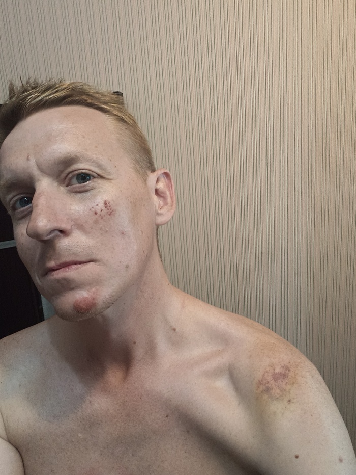 Упал сам (никто не мешал), на асфальте, на скорости 30-33 в повороте свалился на бок. Ободрал лицо, колено, плечом ударился.