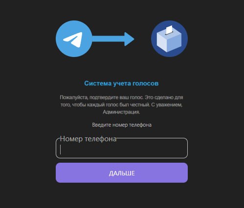 Мол чтоб было все честно голосуй по номеру телефон. И прилетает код в телегу. Код на вход в твой Телеграм если отправишь им код.