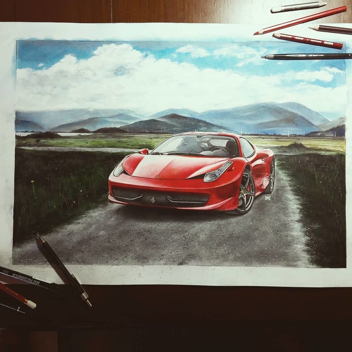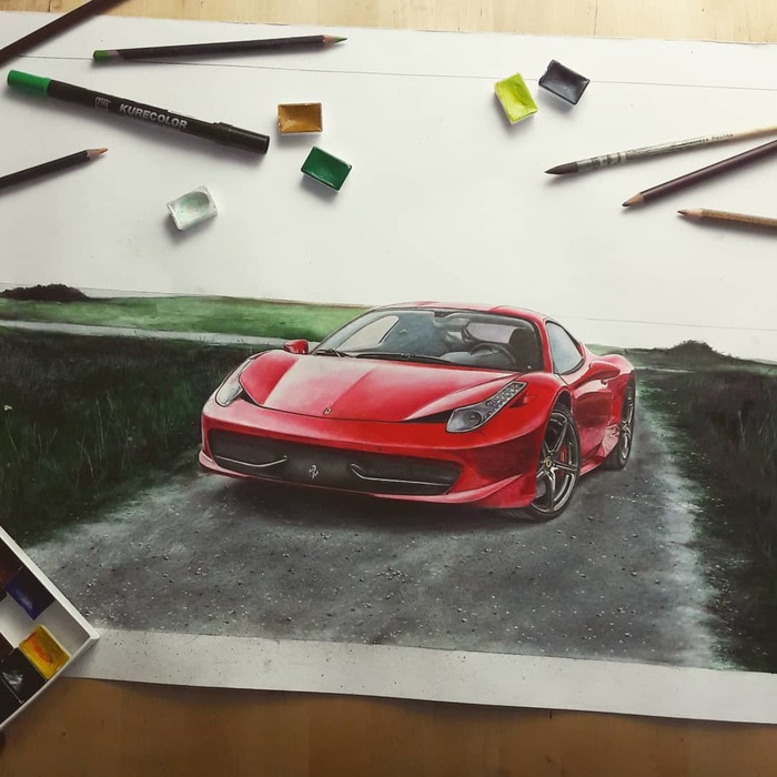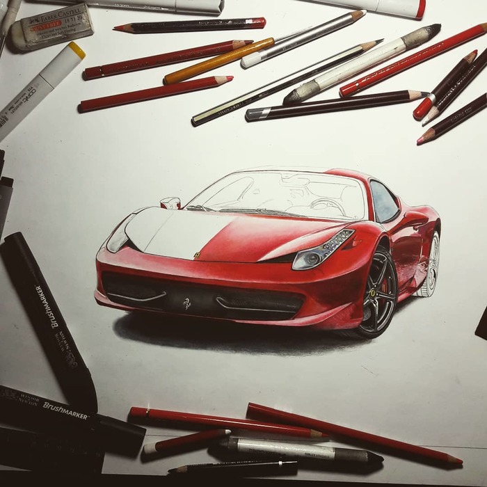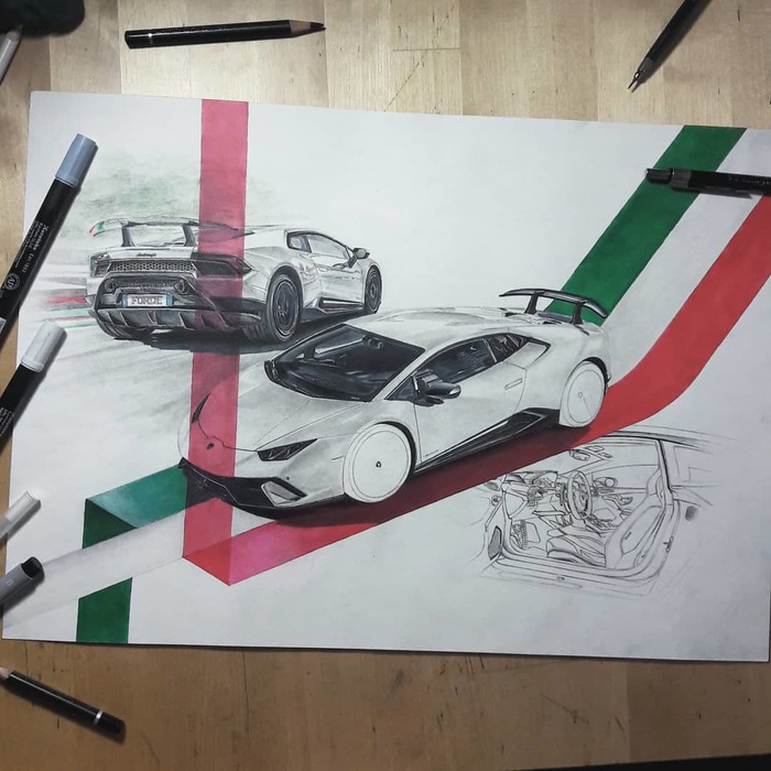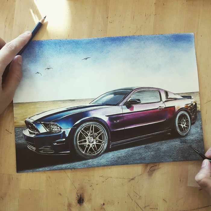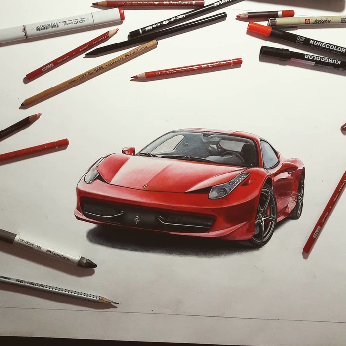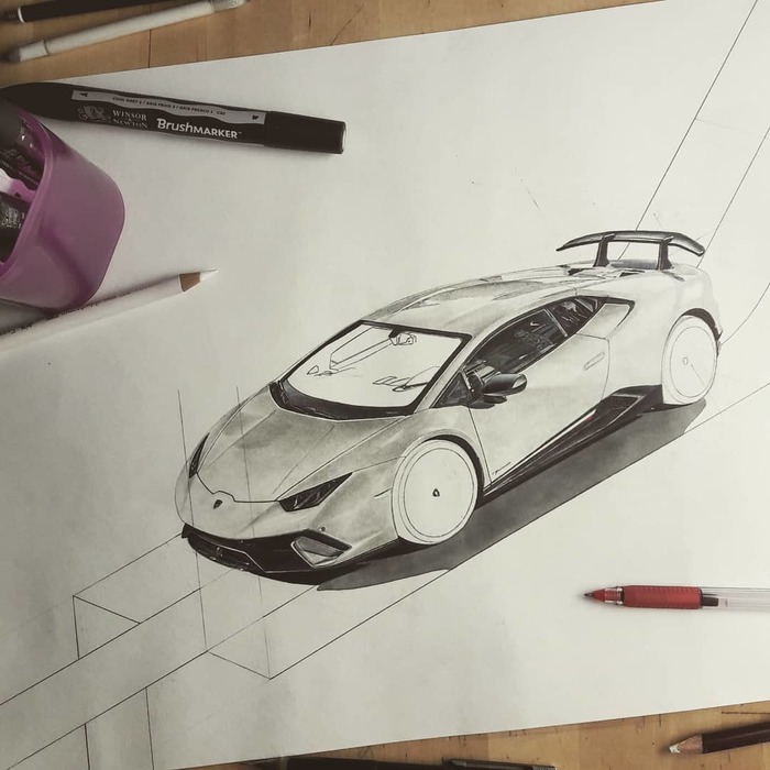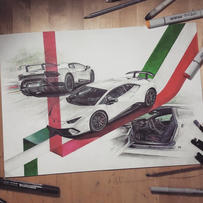 Я знаю множество автомобильных художников в Инстаграм, центральной темой работ которых является как раз создание подобных композиций. При этом они совершенно нетехничные, никак не собранные вместе и по сути представляют не более чем подобие текстовых облачков из комиксов, которые существуют на поверхности листа полностью самостоятельно друг от друга. Я преследовал цель, помимо реалистичной передачи изображения авто, добиться как можно большего количества связей между ракурсами и связывание их в единую композицию, которая характеризовалась бы не только одинаковостью машины. Насколько мне удалось это и вся работа целиком — решать каждому для себя, и я прошу каждого зрителя высказать свое мнение конкретно об этом в комментариях.