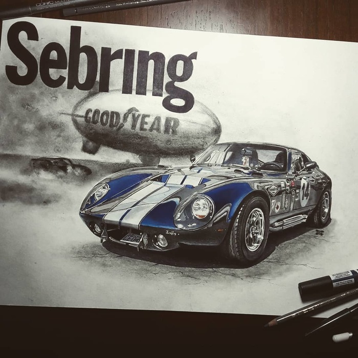 На первом старом фото (это фото его или его отца, точнее утверждать не могу) можно увидеть точно такую же машину с одним лишь отличием — это оригинальный Shelby. На фоне можно видеть рекламный аэростат шинной компании GoodYear — скорее всего мы видим запечатленный на пленке момент гонок на солончаке или в подобном месте. Вторая же картинка — афиша гонки 12 часов Себринга в конце марта 1965 года; с нее мне было поручено лишь скопировать название трассы.