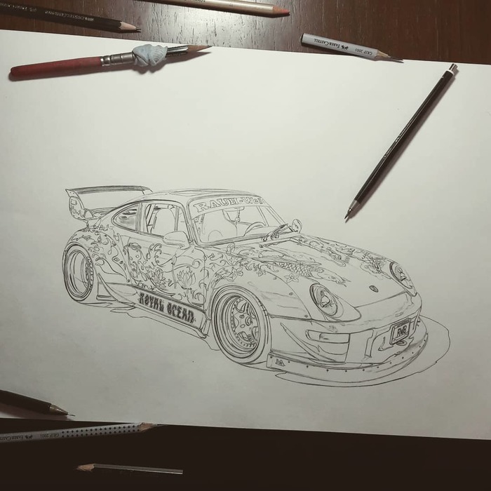 Всем привет! Довольно долго не получалось что-то опубликовать, занят сейчас несколькими сериями плюс никуда не девшимися заказами, посему времени свободного крайне немного. Есть еще большое множество работ уже достаточно давно сделанных, описать которые мне было бы интересно по разным причинам, но сегодня расскажу про совсем свежий рисунок, сделанный буквально день назад. Эта работа во многом необычна, в том числе потому, что делалась по фотографиям из Google. Владелец машины не имел нужной, той самой фотографии, от которой у меня загорелись бы руки, глаза и прочие места, поэтому мы решили собрать необходимый набор в интернете, приведя к оригиналу лишь посредством дорисовки тюнинговых колес, установленных на его машине.