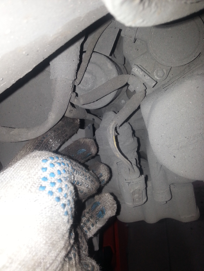 С ABS закончили. Теперь будем разбираться с коробкой. Тут тоже есть болезнь и болезнь эта заключается в перетирании жгута проводов о пластиковую защиту. Жгут проводов проходит по левой стороне, ближе к моторному щиту. Хорошо просматривается с ямы/подъемника или при открученном заднем левом колесе.