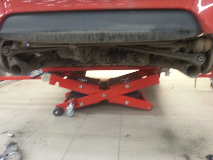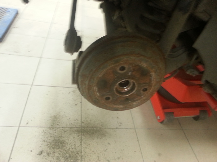 Поднимаем машину на домкрате (можно использовать подъемник, но они все были заняты), снимаем задние колеса и внимательно осматриваем задающие кольца.