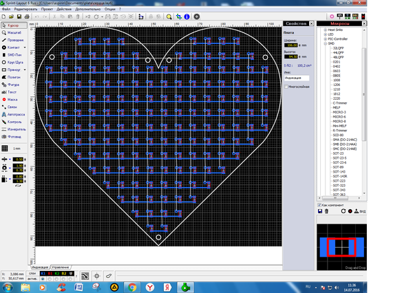 В оригинальном варианте использовались обычные 3мм светодиоды, которых у меня не было. А была куча красных SMD-светодиодов, поэтому, недолго думая, я переразвёл плату. Получилось, кстати, проще, ибо нет геморроя с двухсторонней платой.