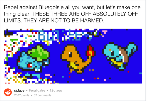 Первого апреля на Reddit появился белый лист площадью 1000 на 1000 пикселей. Любой человек в мире мог нажать на один из пикселей и поменять его на один из 16 цветов. А вот чтобы перекрасить следующий пиксель уже нужно было ждать пять минут. В правилах было указано: «Вы сможете что-то создать, действуя в одиночку. Координируя действия с другими, вы сможете создать гораздо больше».